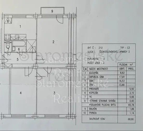 Ponúkame na predaj 3 izbový byt na ulici Československej armády v Košiciach, mestská časť Staré mesto. Nachádza sa na 3. poschodí zo štyroch s balkónom, orientovaným na Juh, a výťahom. Výmera samotného bytu je 66m2 plus balkón 2m2 a pivnicou 1m2. Čerstvo vybrúsené parkety a plastové okná menené približne pred 10 rokmi.